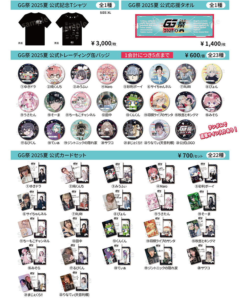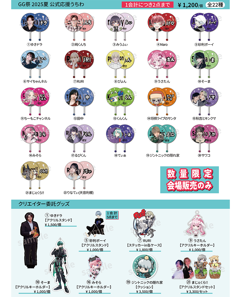 『クリエイター個別2ショットスマホ撮影会』■開催日程・エリア2025年9月6日(土)GG祭 2025夏 会場内の各クリエイターのブースにて■内容:クリエイター個別2ショットスマホ撮影会クリエイターと個別ブースで直接お会いいただき、一緒に2ショット撮影を行うイベントです。※撮影会はお客様のスマートフォンカメラで撮影いたします。他の撮影機器の使用は一切禁止となります。※写真撮影は原則として撮り直しはいたしません。撮り直しは撮影に不備が認められる場合のみ対応させていただきます。撮影後必ず写真を確認していただき、不備があればスタッフ確認後撮り直し可否の判断をいたします。※お客様とクリエイターで一緒に撮影するイベントです。クリエイター単体の撮影はできません。■参加券:クリエイター個別2ショットスマホ撮影会参加券1枚 1,500円(税込)※参加券はイベント当日に会場内で販売します。『クリエイター個別お渡し会』■開催日程・エリア2025年9月6日(土)GG祭 2025夏 会場内の各クリエイターのブースにて■内容:クリエイター個別お渡し会クリエイターと個別ブースで直接お会いいただき、クリエイターからイベント限定ポストカードをお渡しするイベントです。イベント限定ポストカードには、お客様のお名前をクリエイターが直筆で記入いたします。※こちらで用意するポストカード以外の私物には記入できません。※クリエイターのサインの記入はできません。※クリエイターへの接触行為は禁止です。発覚した場合、退場いただく場合がございます。■参加券:クリエイター個別お渡し会参加券1枚 1,000円(税込)※参加券はイベント当日に会場内で販売します。! 2ショットスマホ撮影会・お渡し会 共通注意事項 !