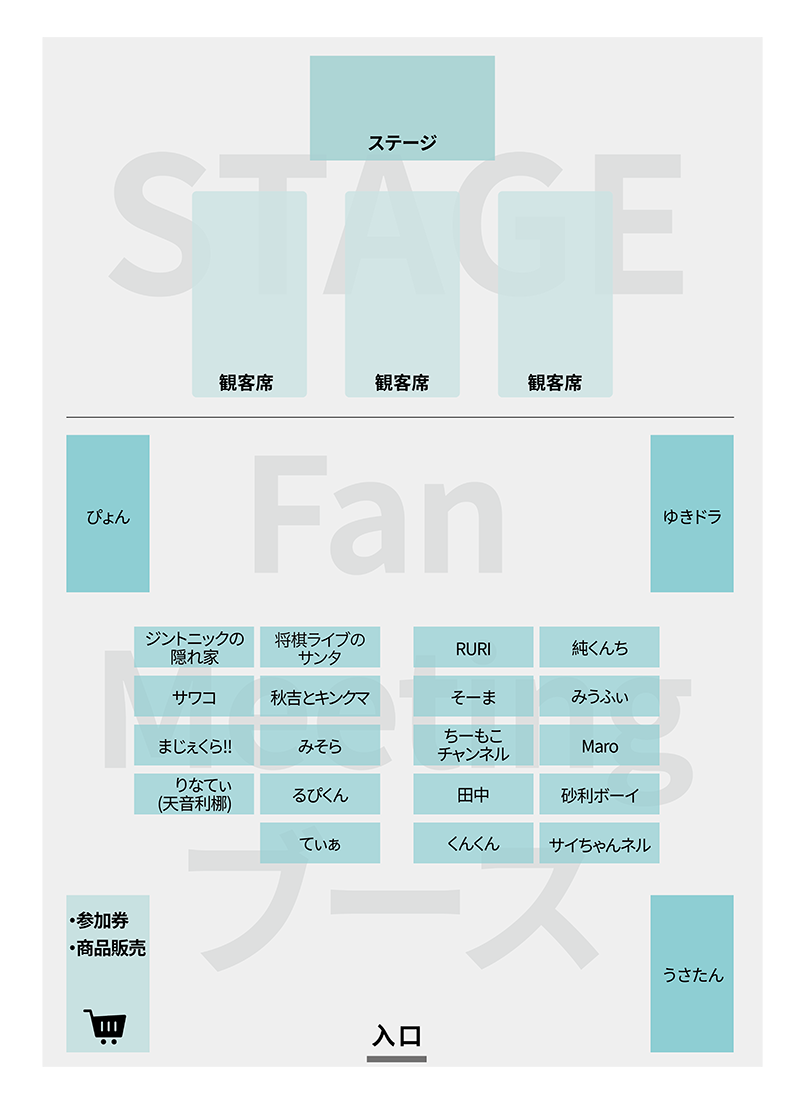 ご来場の皆様が安全かつ快適にイベントをお楽しみいただくため、以下の事項を必ずお守りください。1.座席に関する注意:・会場の都合により、着席いただける座席(自由席)には限りがございます。 座席が埋まりましたら、立ち見エリアでの観覧となります。 すべてのご来場者様に座席を提供することが難しい場合がございますこと、 何卒ご理解賜りますようお願い申し上げます。2.持ち込み禁止物:・危険物(刃物、可燃物、花火等)。・無許可の応援横断幕、旗、ホーン、大型ライトボード等、他のお客様の観覧を妨げる可能性のある物品。・プロ仕様の撮影機材(望遠レンズ、三脚、レフ板等)。3.禁止行為:・大声での会話、悪意のある押し合い、他のお客様への迷惑行為。・無断での録音、録画、舞台パフォーマンスの撮影。・許可のないライブ配信。4.撮影に関する規定:・イベント全体を通じて、撮影(スマートフォンによる撮影を含む)は禁止とさせていただきます。・会場内アナウンスおよびスタッフの指示に従ってください。 違反された場合、退場をお願いすることがあります。5.撮影会について:・クリエイターとの撮影について、スタッフが来場者の皆様のスマートフォンを使用して撮影する形式でございます。・スムーズな進行のため、現場の指示に従っていただきますようお願いいたします。6.公式撮影について:・会場内では公式のライブ配信および撮影が行われます。・ご来場者が公式映像に映り込む可能性があり、これらの写真や映像は宣伝や報道等に使用される場合があります。・ご来場をもって、撮影およびその使用に同意いただいたものとみなします。 個別の通知は行いませんので、ご了承ください。